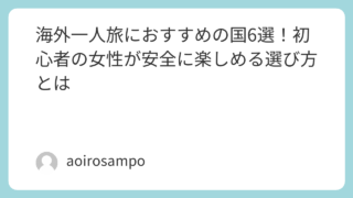 初めての女性の海外一人旅におすすめの国を6つ紹介。治安や移動のしやすさを基準にした選び方や、実体験をもとにした失敗談、防犯対策までわかりやすく解説します。週末旅行向きの近場から、少し遠出したい人向けの行き先まで幅広くまとめたのでぜひご覧ください!